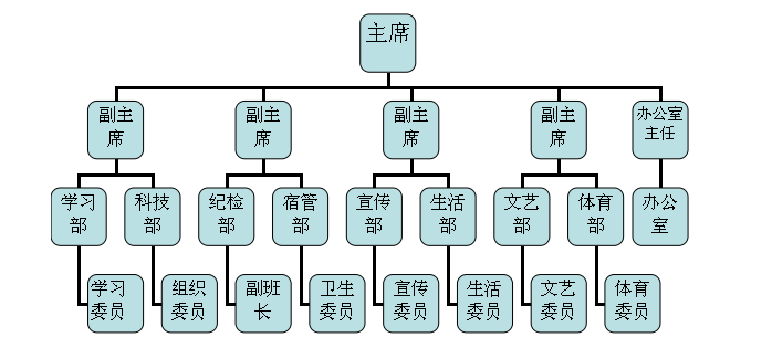 主席团包括主席一名,副主席四名及办公室主任;各部设部长一名,副部长两名;各部人员由大一和大二各班级相关委员组成。