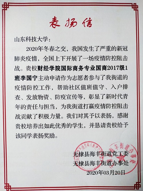 近日,betway88西汉姆联收到一封来自无棣县海丰街道党工委发来的表扬信,信中对国际商务2017级1班李国宁同学主动参与疫情防控工作表示感谢。