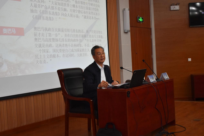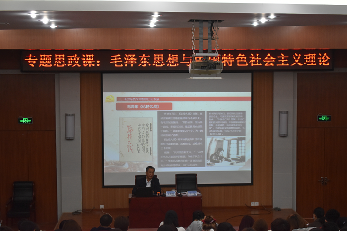王少鹏从毛泽东简介、毛泽东思想、毛泽东哲学思想的历史发展、毛泽东思想的历史地位等四个方面阐述了毛泽东思想是马克思主义中国化第一次历史性飞跃的理论成果,是中国共产党和中国人民历尽艰辛获得的宝贵精神财富。在讲授中,王少鹏饱含崇敬心情,以旁征博引的史料,详细介绍了毛泽东主席的个人生平。随后,通过早期哲学思想、科学理论的萌芽形成和系统化、科学理论的不断丰富、在社会主义革命和建设时期的新发展等方面介绍了毛泽东哲学思想的科学体系,并结合时势深入解读了《中国社会各阶级的分析》《星星之火可以燎原》《反对本本主义》《实践论》《矛盾论》《论持久战》《论十大关系》等著作的产生渊源及其巨大的战略影响。最后,深情追忆了毛主席的革命生涯和名人轶事。讲授全方位展现了毛主席光辉伟大、全心全意为人民服务的一生,总结了以毛泽东同志为主要代表的中国共产党人对中国革命和建设作出的卓越贡献。