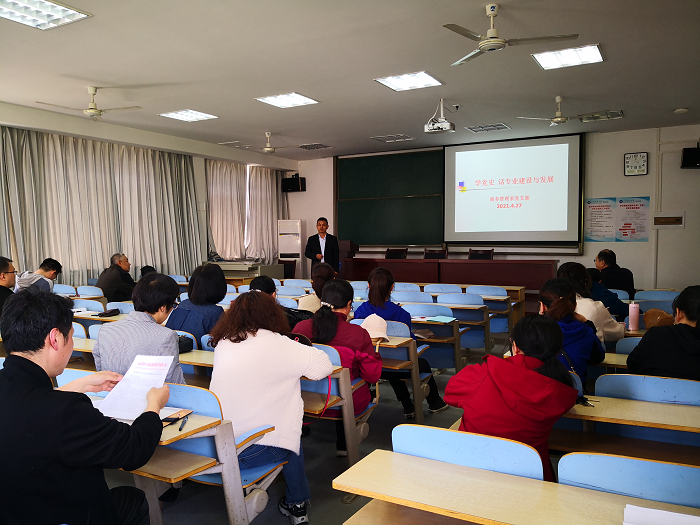 4月27日,商务管理系党支部在全系举办了一次《学党史 话专业建设与发展》主题党日活动,支部书记邢志良从习近平总书记在清华大学考察时的重要讲话开始,联系专业建设的实际情况,认真学习了总书记的有关重要论述,然后对国际商务专业的现状、专业建设依托背景进行了分析,提出了国际商务专业未来五年的发展目标与思路,以及专业建设的具体措施、注意问题和需要树立的观念。