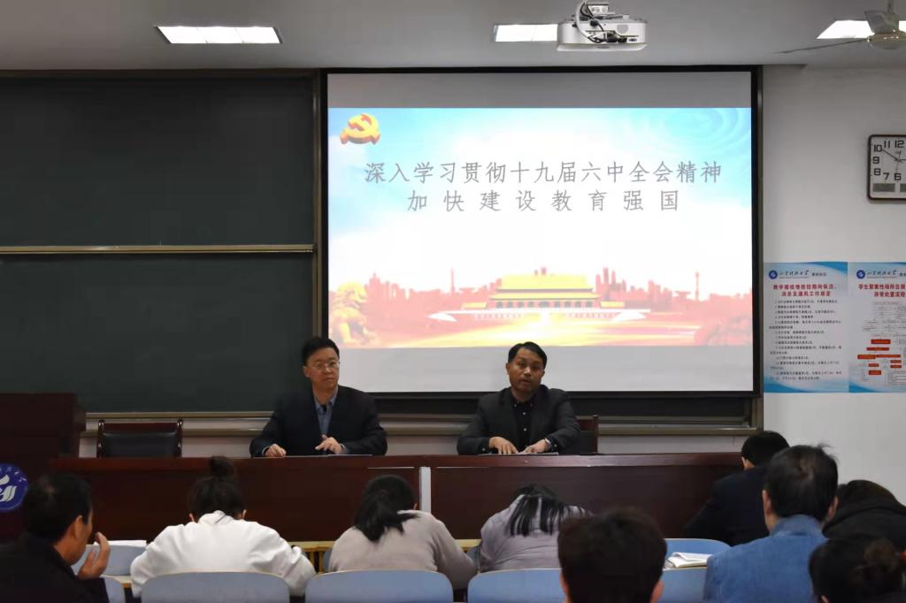 会议学习了《中国共产党第十九届中央委员会第六次全体会议公报》、《中共中央关于党的百年奋斗重大成就和历史经验的决议》,学习了教育部部长怀进鹏的《深入学习贯彻党的十九届六中全会精神加快建设教育强国》。
