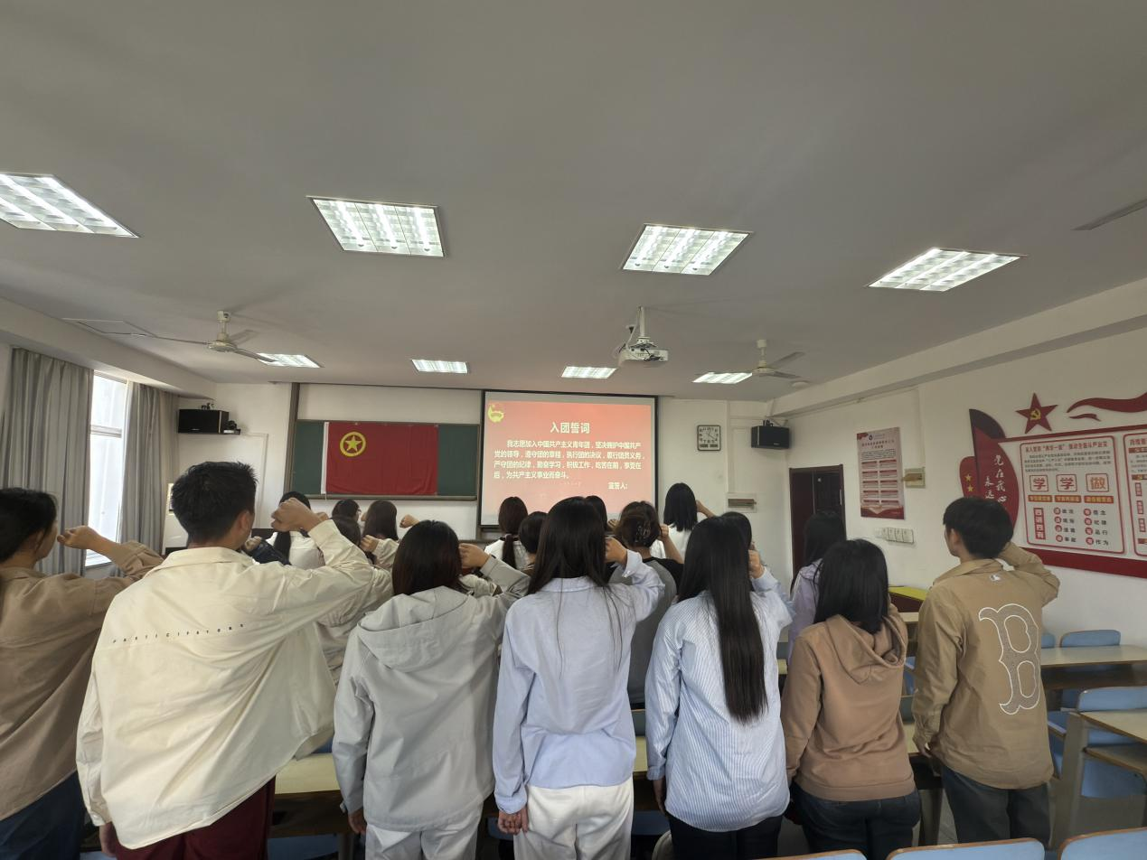 在活动中,新发展团员们展现出饱满的精神状态和高涨的热情,他们在领誓人的引领下,面对团旗,举起右手,庄严宣誓,表达了对团组织的忠诚以及对共产主义事业的坚定信念。